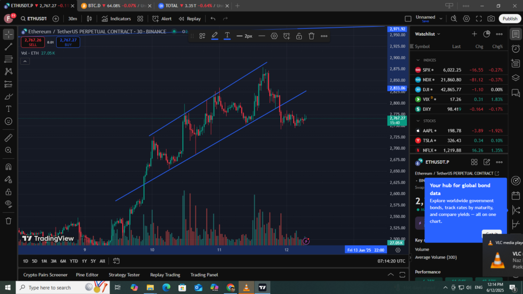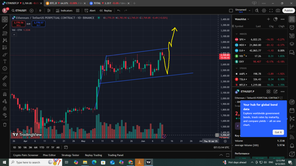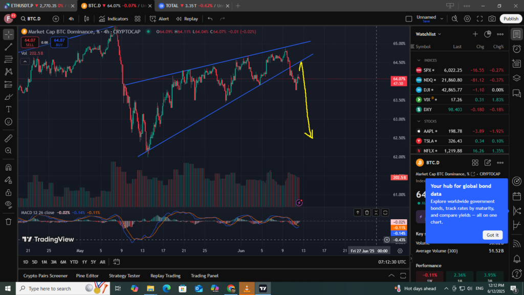 Let’s begin by discussing the total cryptocurrency market cap. As of June 12, 2025, the market stands at approximately $3.35 trillion, as visible on the chart. The market recently faced rejection near the $3.44 trillion level, indicating a possible short-term top. We currently have a horizontal support around $3.18 trillion, along with a trendline support near $3.08 trillion. Given these levels, we may now observe the market heading downward from this point, at least in the short term.
