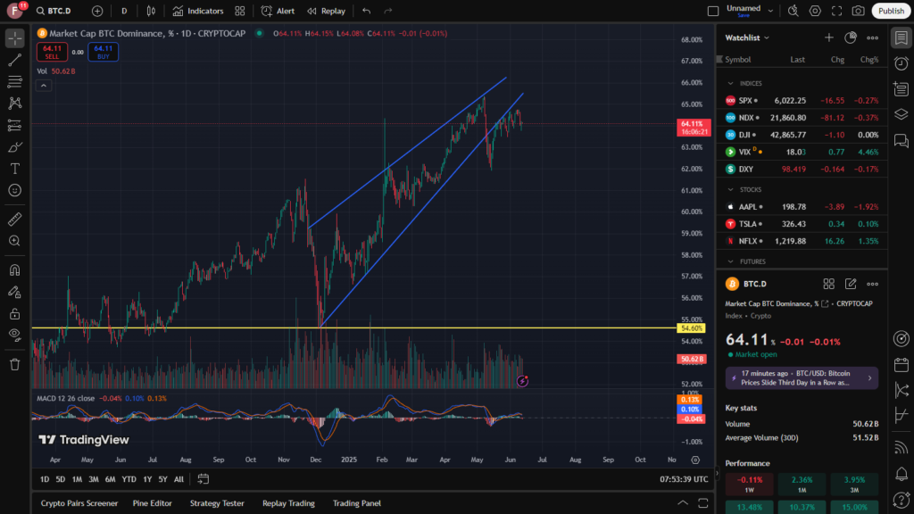 Now let’s talk about Bitcoin Dominance (BTC.D). On the 1-day timeframe, BTC.D is forming a rising wedge pattern, which is typically considered a bearish reversal pattern. This suggests that if Bitcoin dominance starts to drop, we could see a potential rally in altcoins — in other words, a BTC.D dump often leads to an altcoin pump.